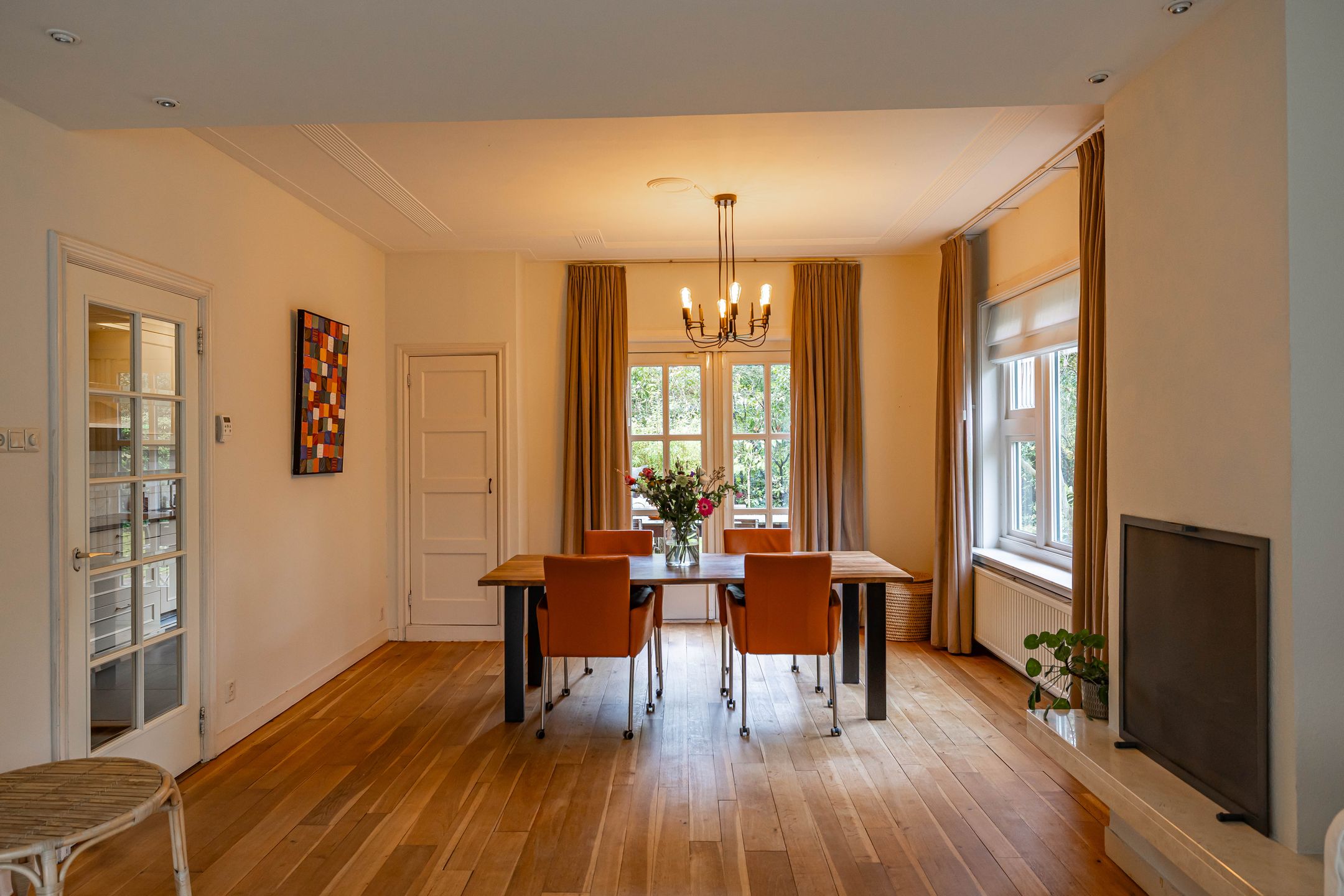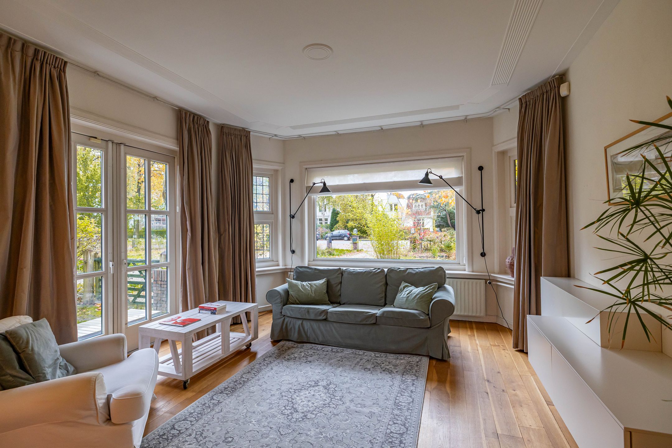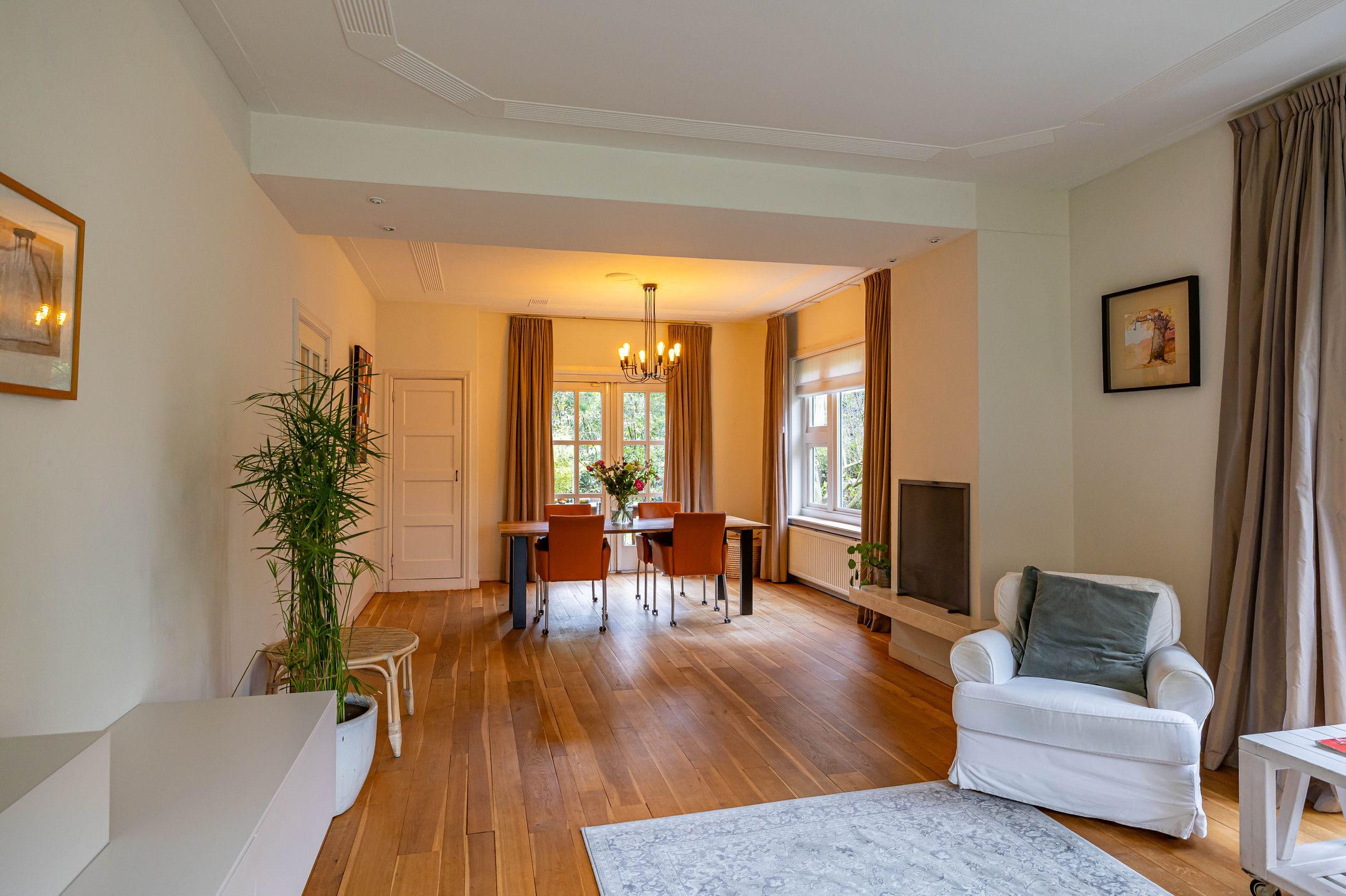 De woonkamer is ca. 39 m² groot met een prachtige parketvloer en open haard. Je kijkt door de vele raampartijen uit op de voor-, zij- en achtertuin, dus de verbinding met het groen is er altijd. Aan de zijkant én achterkant zijn er openslaande deuren om heerlijk de tuin in te stappen.
